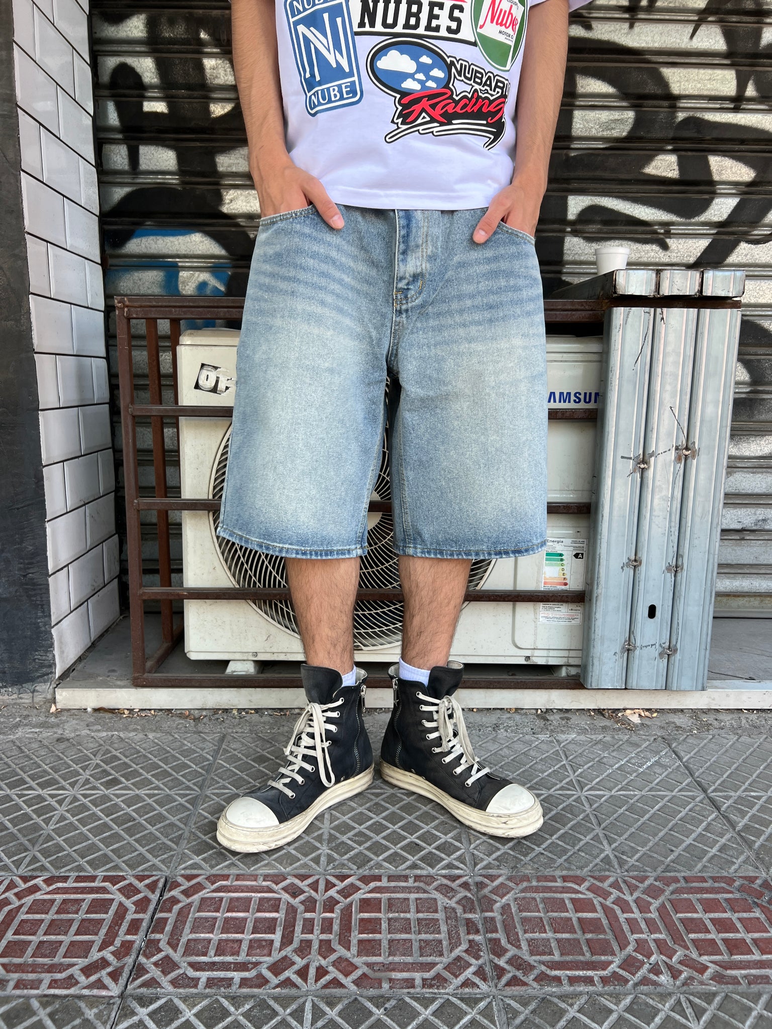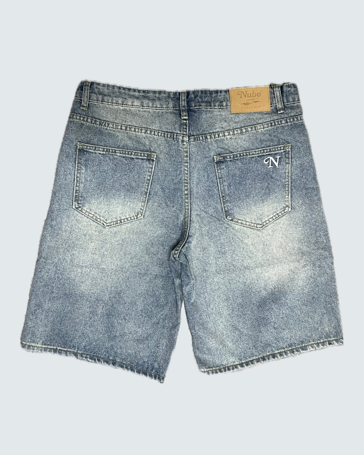 Shorts de mezclilla fit baggy, color azul lavado con bordado en bolsillo trasero.