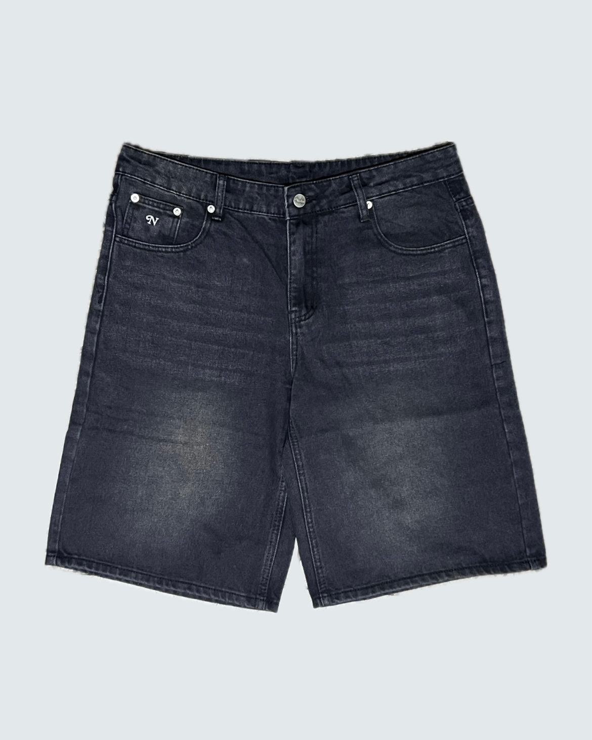 Shorts de mezclilla fit baggy, color negro lavado con bordado en bolsillo trasero.