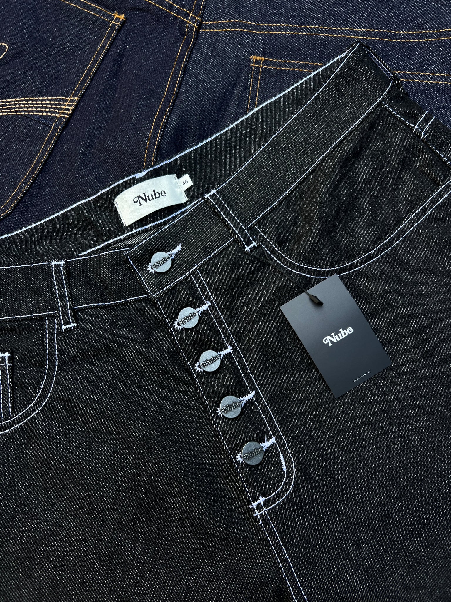 Shorts de mezclilla negra fit baggy con bordado en bolsillo trasero y delantero.